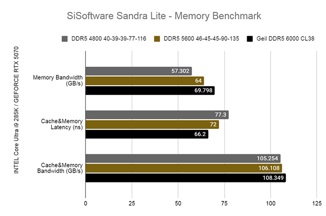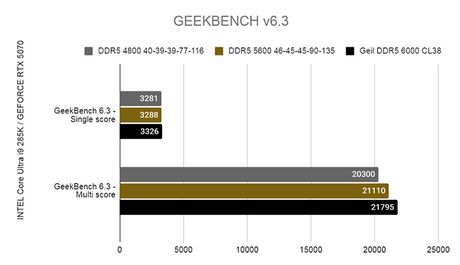 성능 향상 폭은 수치상으로는 제한적이다. Geekbench 6.3 테스트에서 싱글코어 점수는 기본 6000MHz 대비 약 0.2% 상승(3326 → 3334), 멀티코어 점수는 약 1.8% 상승(21795 → 22181) 에 그쳤다.