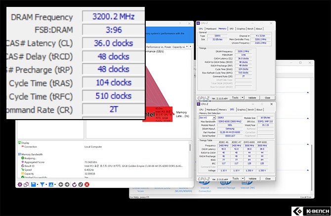 이는 단순한 클럭 상승이 아니라, 오버클럭 과정에서 메모리 타이밍을 CL36 수준으로 조정하면서 지연 시간이 줄어든 결과로 볼 수 있다.