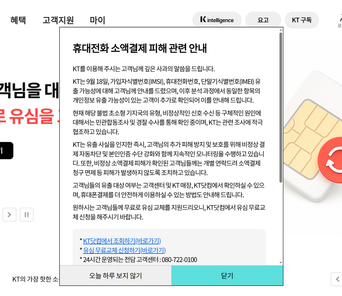 KT가 휴대전화 소액결제 피해 관련 후속 대책으로 전 가입자를 대상으로 유심 무상 교체 서비스를 시작한다.