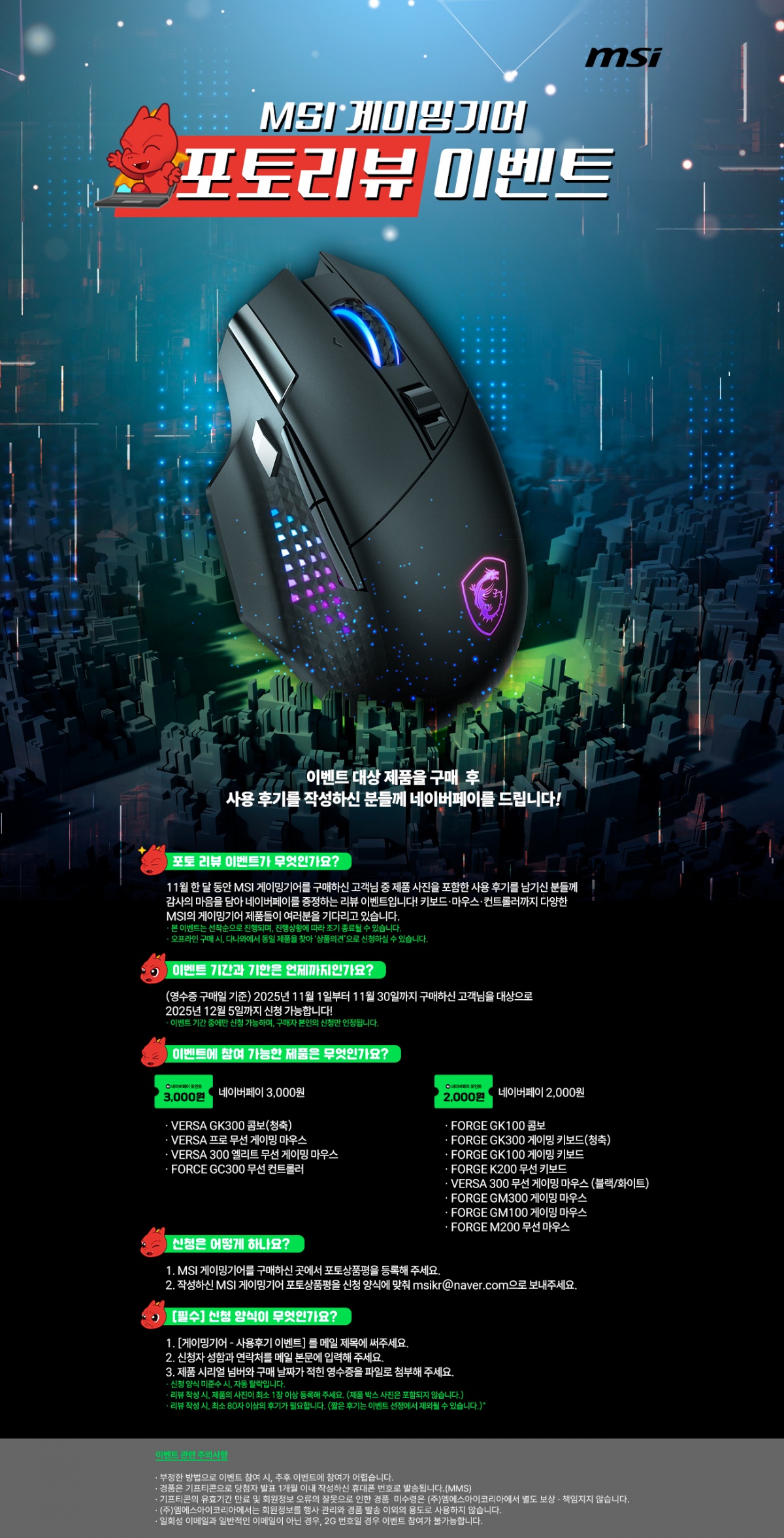 ㈜엠에스아이코리아(대표 공번서)는 MSI 인기 게이밍기어를 구매한 고객을 대상으로 11월 한 달간 사용 후기 이벤트를 진행한다고 밝혔다. 이번 이벤트는 고객들이 직접 제품 사용 후기를 공유할 수 있는 기회를 제공함과 동시에, 참여 고객에게는 제품별 2,000원~3,000원 상당의 네이버페이 포인트를 선착순으로 지급한다.