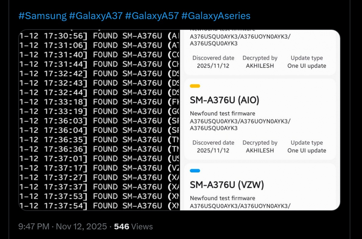 모델 번호는 SM-A376B, 펌웨어 버전은 ‘A376USQU0AYK3’으로 확인됐다. 테스트 펌웨어가 삼성 내부 서버에 등록된 것은 삼성이 갤럭시 A3x 시리즈 차세대 모델 개발을 본격화했다는 신호로 해석된다고 외신은 전했다.