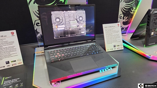그중에서도 한켠에서 내부 모습을 보여주는 이미지가 디스플레이에 띄워져있으면서, 옆에 바닥면을 보여주기 위한 모델을 추가로 전시된 모델, 'MSI 레이더 16 Max HX B2W' 노트북을 볼 수 있었다.