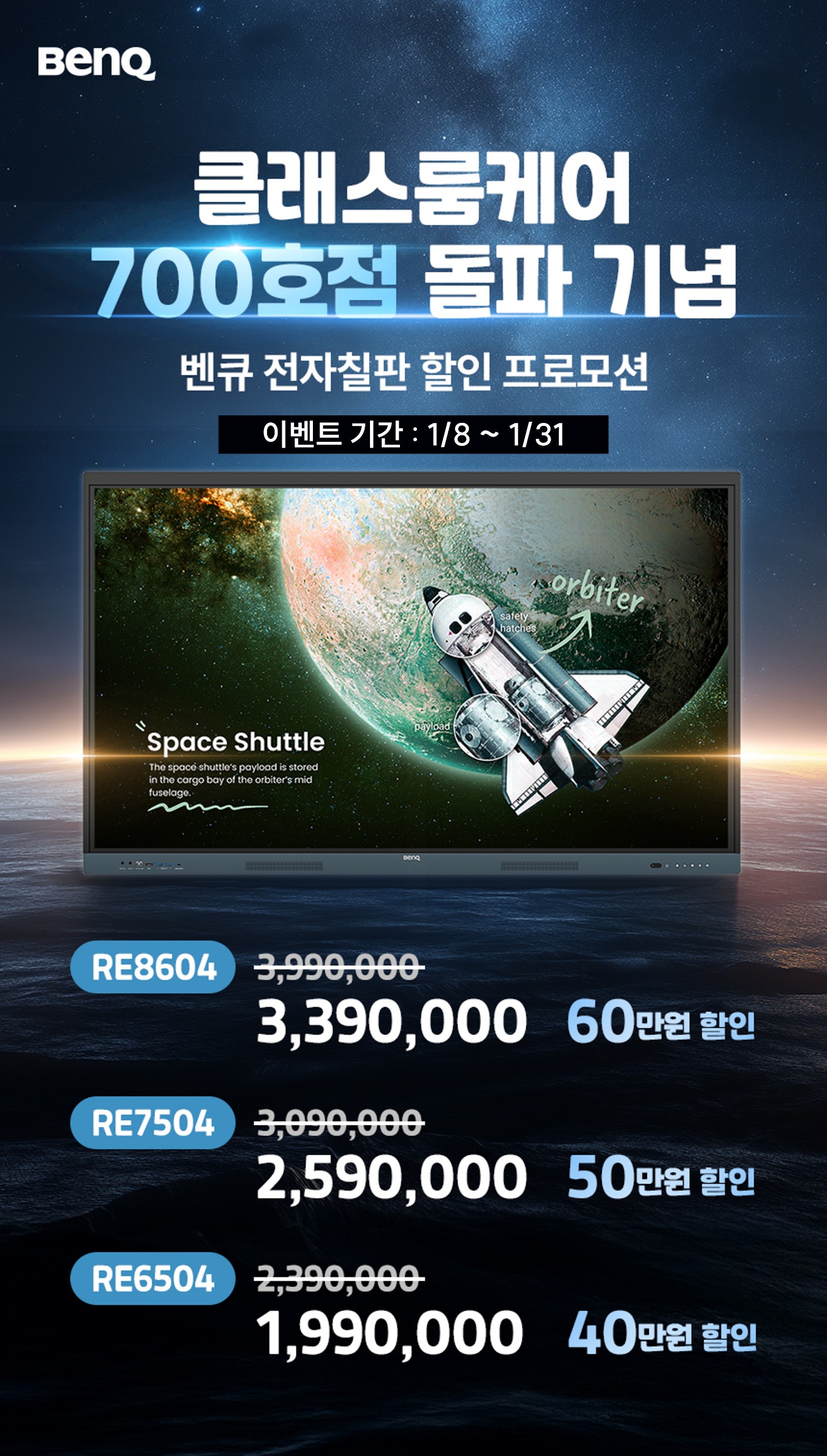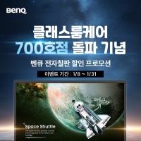 글로벌 디스플레이 전문 브랜드 벤큐(지사장 소윤석)는 자사 전자칠판 고객 인증 프로그램 ‘클래스룸케어™ 인증점’이 전국 700호점을 돌파했다고 밝혔다. 이를 기념해 벤큐는 2026년 1월 8일부터 1월 31일까지 전자칠판 RE 시리즈 주요 모델을 대상으로 최대 60만 원 할인 혜택을 제공하는 프로모션을 진행한다.