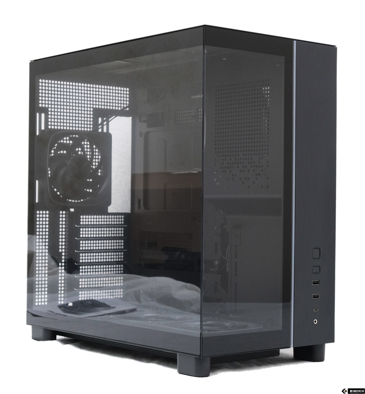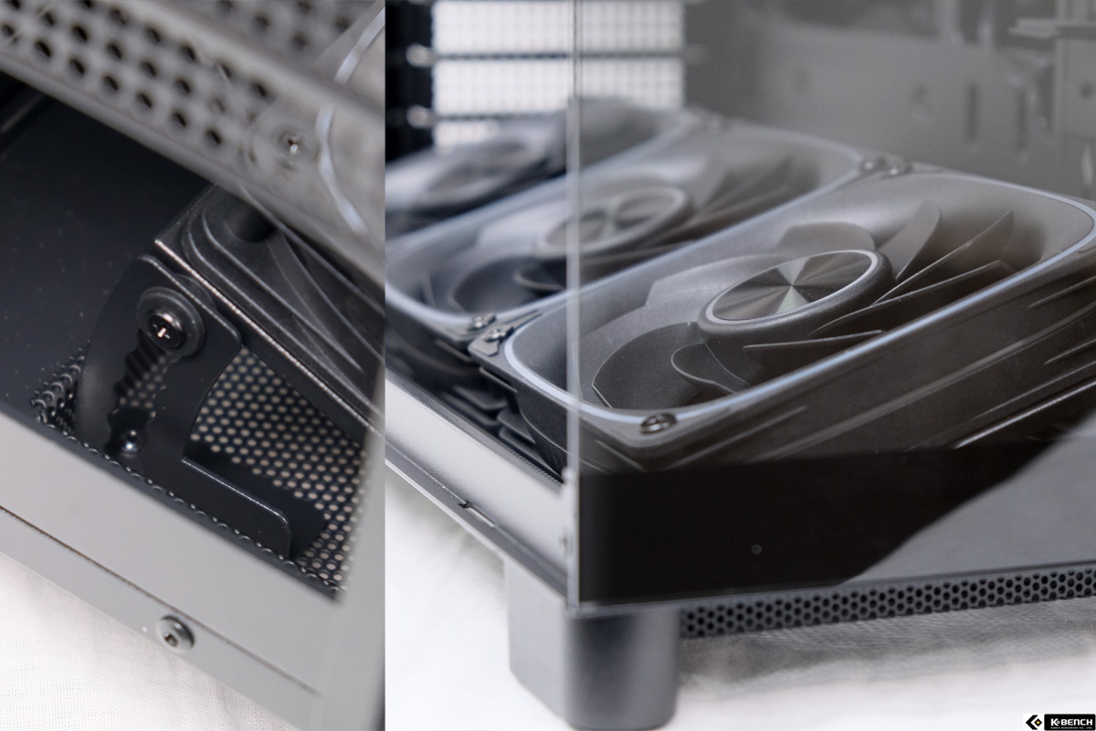 다만 이 제품은 구조에서 분명한 차별점을 갖는다. 전면 상단 PSU를 기반으로 한 듀얼 챔버 설계, 하단 흡기를 적극적으로 활용한 공기 흐름, 팬을 경사지게 배치할 수 있도록 만든 선큰 구조는 기존 케이스와는 다른 접근이다. 이러한 구조적 선택은 그래픽카드 중심의 냉각 효율 개선으로 이어지며, 설계 의도가 실제 사용 환경에서도 비교적 명확하게 드러난다.