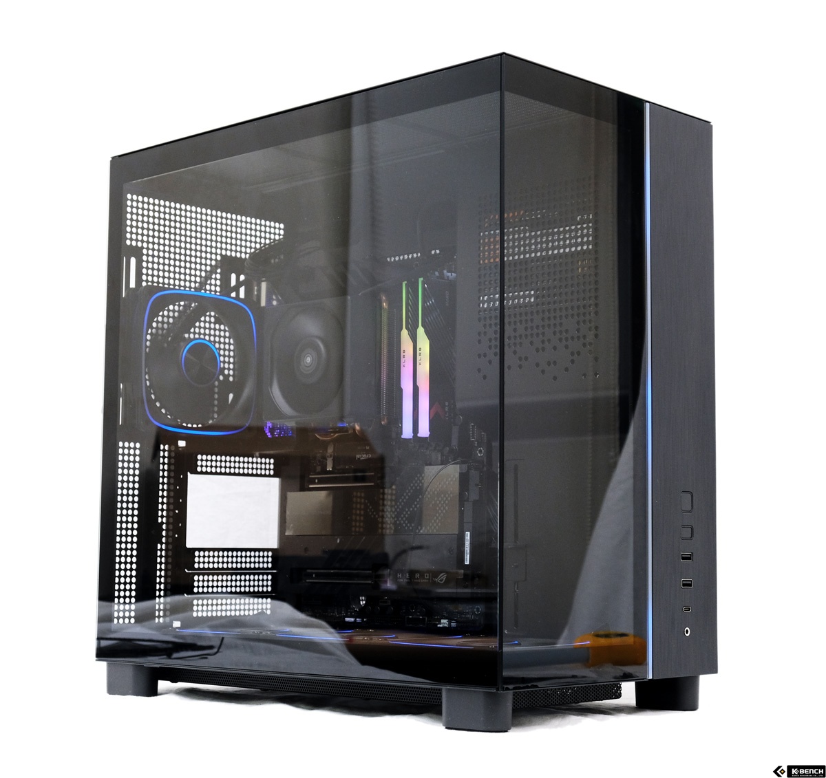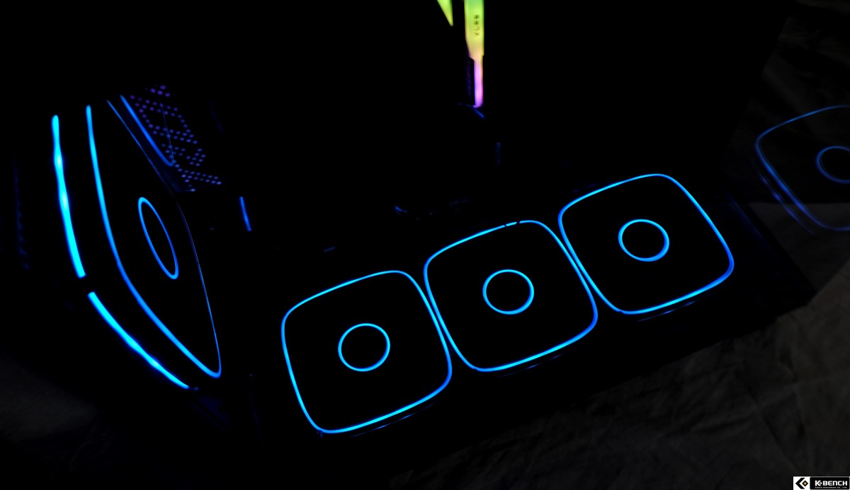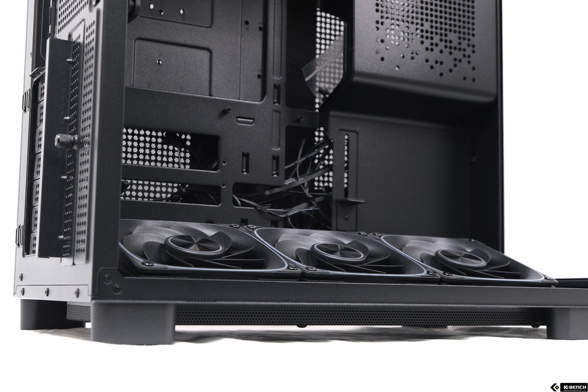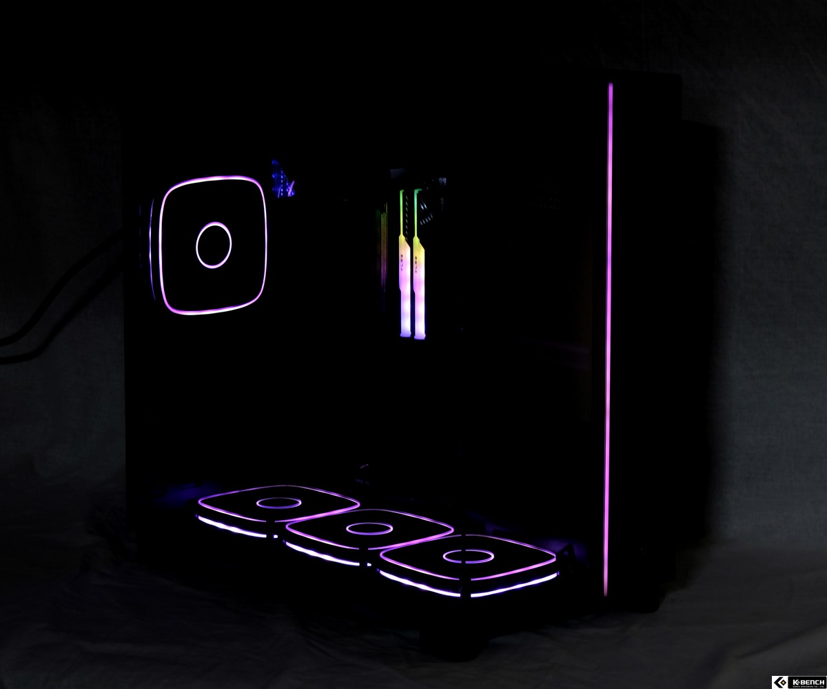 이 과정에서 RGB 팬의 LED 역시 사선 방향으로 노출되면서, 강화유리 패널을 통해 보이는 입체감이 살아난다. 하단 선큰 구조는 단순한 형태 변화가 아니라, 냉각 효율과 시각적 만족도를 함께 고려한 설계라는 점에서 이 케이스의 성격을 잘 드러내는 요소다.