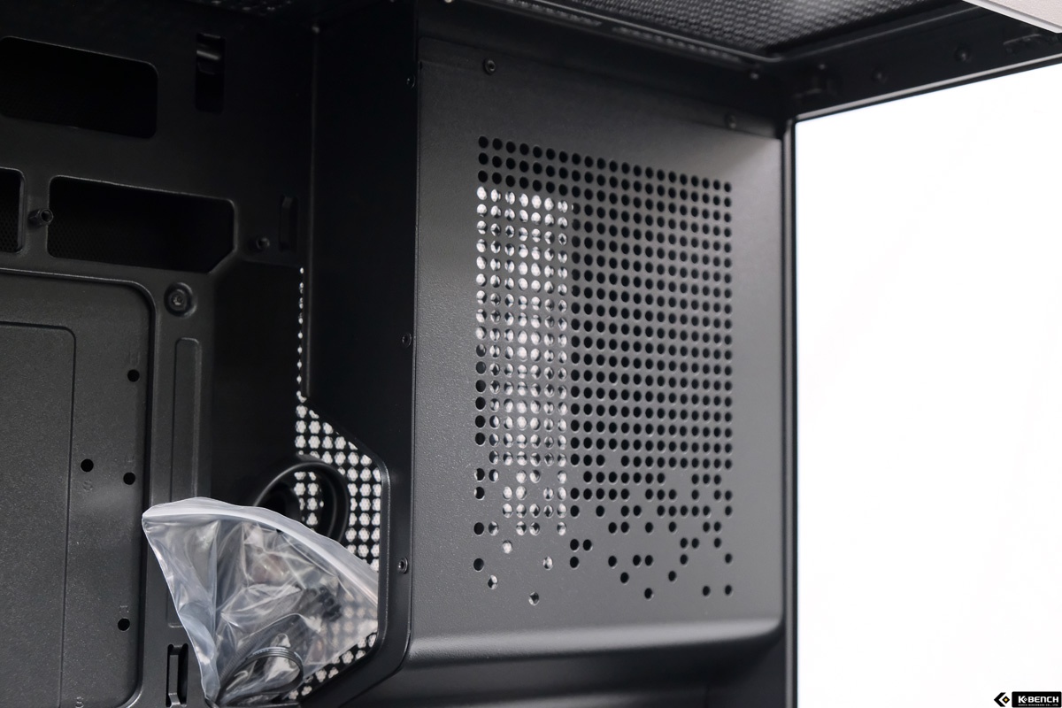 전면 상단에 배치된 PSU 챔버 쪽 공간은 깊이가 약 13.4cm 수준으로 줄어든다. 이로 인해 E-ATX 메인보드는 장착이 불가능하지만, 일반적인 ATX 규격을 사용하는 환경에서는 큰 제약으로 작용하지 않는다. 해당 공간은 구조적으로 추가 부품을 배치할 필요가 없는 영역이기도 해, 실사용에서 불편함으로 이어질 요소는 아니다.