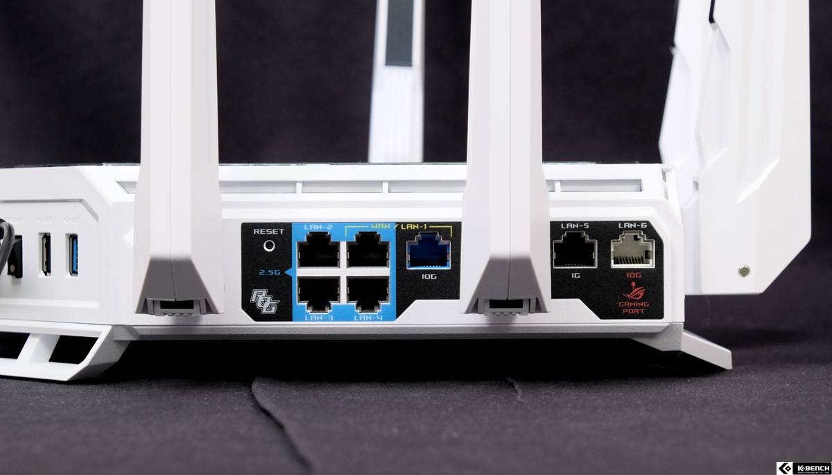 GT-BE19000AI는 유선과 무선 양쪽에서 모두 플래그십이라는 표현이 어울리는 구성으로 설계됐다. 먼저 유선 네트워크는 총 31Gbps 대역폭을 제공한다. 포트 구성은 10Gbps 포트 2개, 2.5Gbps 포트 4개, 1Gbps 포트 1개로 이뤄져 있으며, 고성능 네트워크 환경을 전제로 한 배치다. 이 중 10Gbps 포트 하나는 WAN/LAN 겸용으로 사용할 수 있고, 나머지 10Gbps 포트 하나는 게이밍 전용 포트로 할당돼 별도의 설정 없이 게임 트래픽을 자동으로 우선 처리한다.