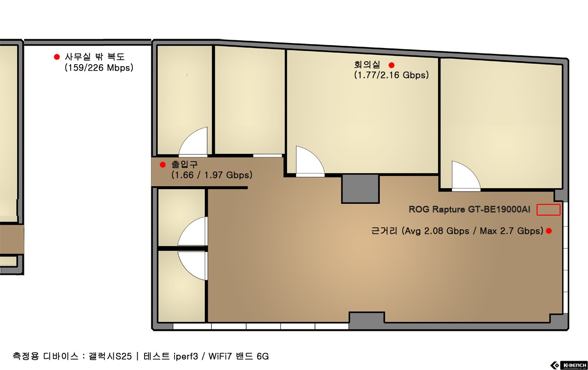 GT-BE19000AI의 실제 커버리지와 속도를 확인하기 위해 사무실 도면을 기준으로 여러 지점에서 실측 테스트를 진행했다. 공유기는 사무실 내부 한쪽에 설치했고, 측정 지점은 근거리, 회의실, 출입구, 사무실 외부 복도로 나눠 설정했다. 테스트 단말은 갤럭시 S25를 사용했으며, 속도 측정은 iPerf3 기반으로 진행했다. 무선 환경은 Wi-Fi 7 중 6GHz 대역을 기준으로 설정했다.