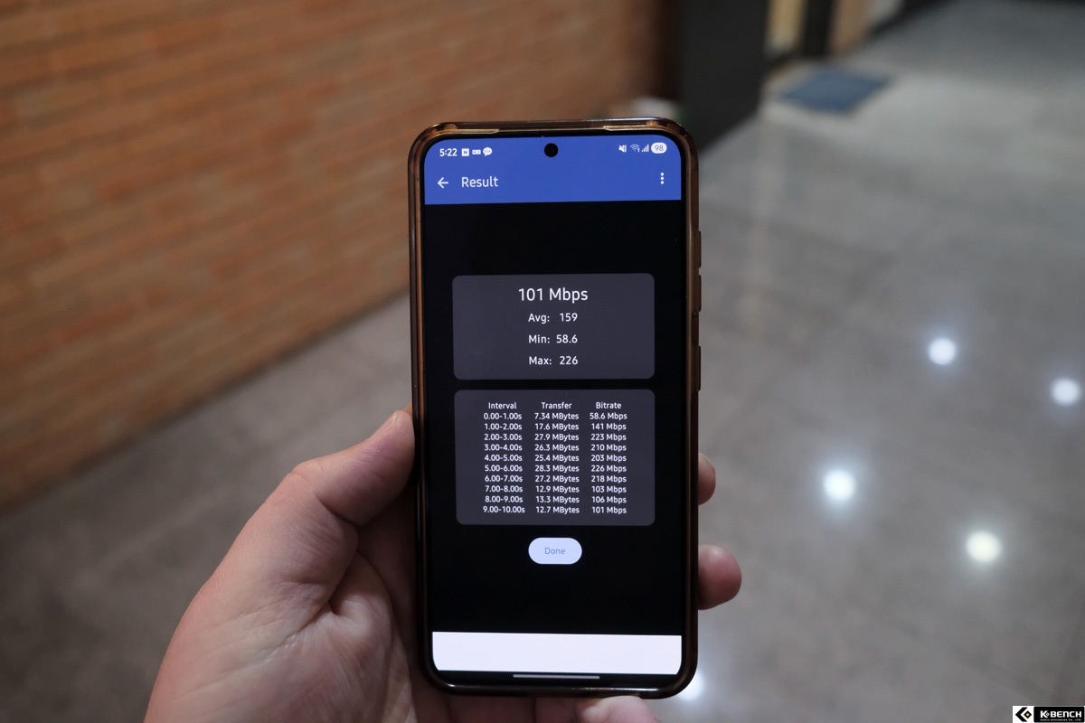 특히 눈에 띄는 결과는 사무실 밖 복도 구간이다. 여러 개의 벽과 출입구를 통과한 환경임에도 6GHz 연결이 끊기지 않았고, 최대 226Mbps, 평균 159Mbps 수준의 속도가 측정됐다. 일반적으로 6GHz 대역은 직진성이 강해 장애물에 취약한 것으로 알려져 있는데, 이 정도 거리와 구조에서도 연결이 유지됐다는 점은 안테나 설계와 RF 튜닝, 출력 제어가 상당히 잘 이뤄졌음을 보여준다.