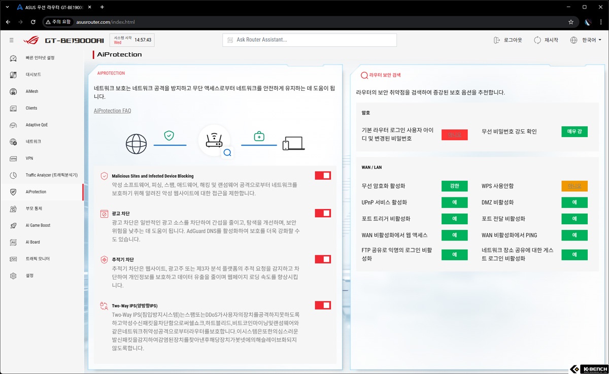 이처럼 GT-BE19000AI의 AI 서비스는 개별 기능을 나열하는 수준을 넘어, 네트워크 환경 전반을 분석하고 최적화하는 구조로 설계됐다. AI 코어를 중심으로 네트워크를 제어한다는 점이 기존 공유기와의 가장 큰 차이다.
