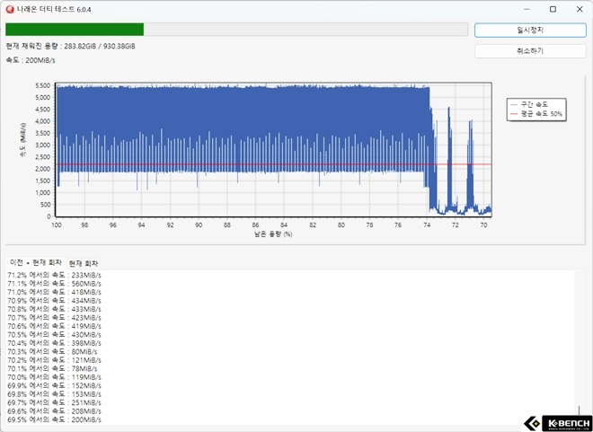 연속 쓰기 테스트에서는 SLC 캐시 구조의 효과로 1TB 기준 전체 25% 정도, 약 250GB 구간까지는 높은 쓰기 성능이 유지되며, 캐시 소진 이후에는 점진적인 전송 속도 감소 패턴을 보인다.