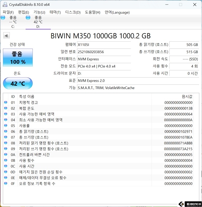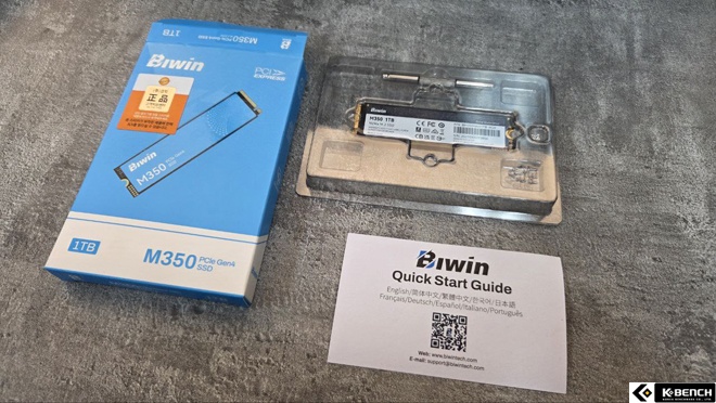 케이벤치에서 살펴본 BIWIN M350 M.2 NVMe는 1TB 용량의 모델로, PCIe Gen4 x4 인터페이스와 NVMe 1.4 프로토콜을 기반으로 설계된 SSD다.
