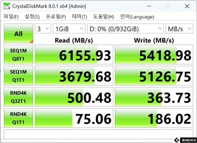 다만 DRAM-less 구조 특성상 낮은 큐 깊이 환경(Q1T1)에서는 고급 DRAM 탑재 SSD 대비 수치상 성능 차이가 나타나는 경향은 존재한다. 그러나 실제 체감 환경에서는 일상적인 작업 패턴에서 큰 불편을 느낄 수준은 아니며, 일반 사용자 환경에서는 충분히 안정적인 반응성을 제공한다.
