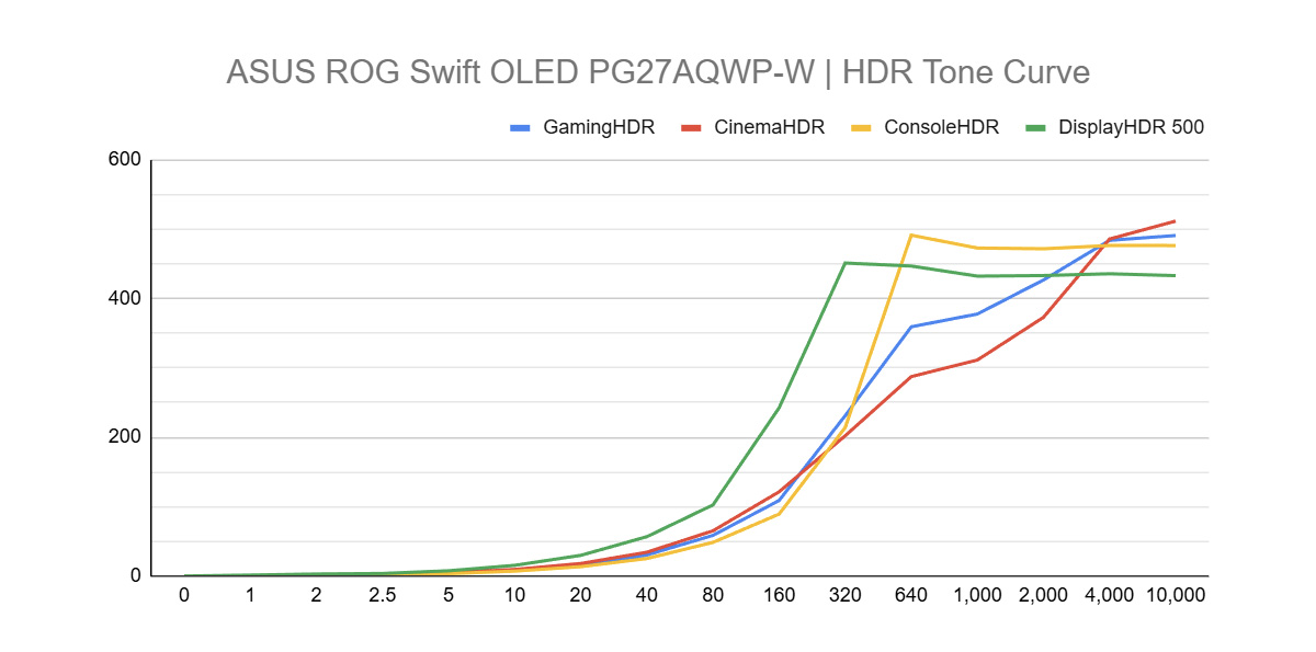 PG27AQWP-W의 HDR 구조는 ‘스펙 중심 HDR’이 아니라 실사용 중심 HDR에 가깝다. 기본적으로 DisplayHDR 500 인증을 받은 모델이며, HDR 화면 모드는 GamingHDR / CinemaHDR / ConsoleHDR / DisplayHDR 500 총 4가지가 제공된다. 각 모드는 톤 매핑 방식과 명암 표현 구조가 서로 다르게 설계돼 있어 콘텐츠 성격에 따라 화면 인상이 달라지지만, 공통적으로 복합 씬 기준 밝기는 500cd/m² 초반 수준을 크게 벗어나지 않는다.