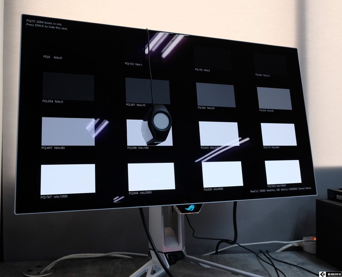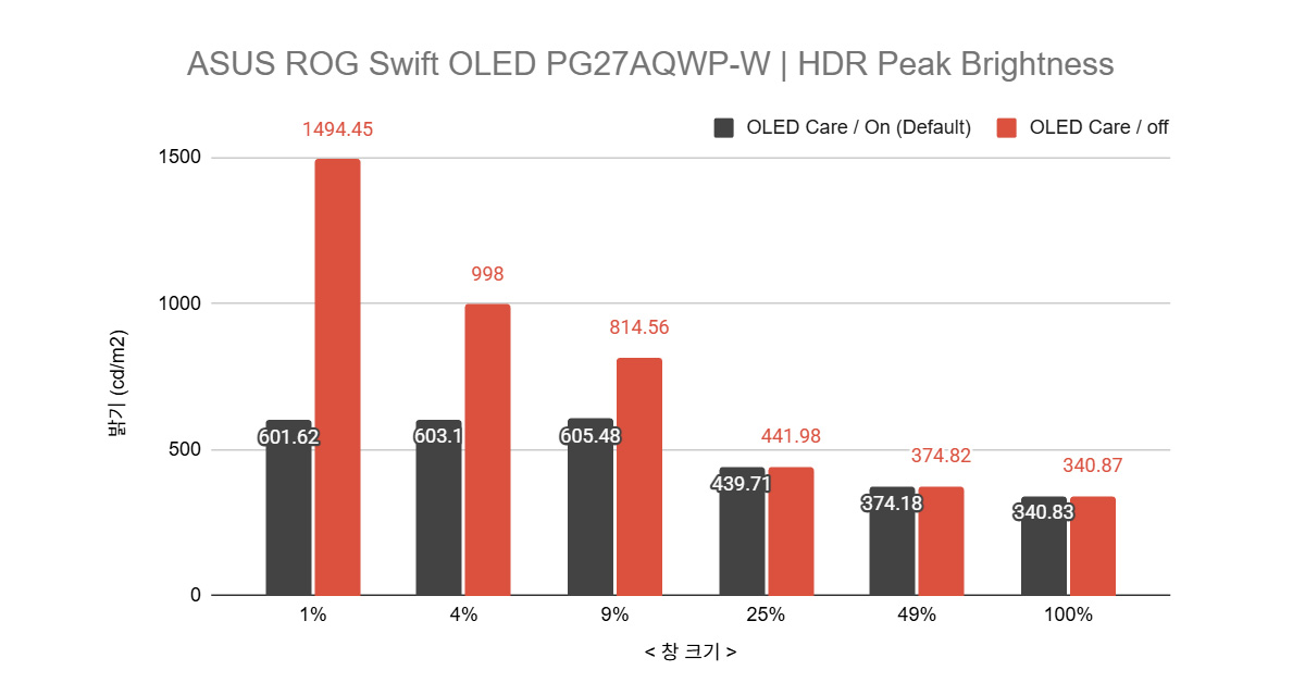 PG27AQWP-W의 최고 밝기 스펙인 1500cd/m²는 특정 조건에서 경험할 수 있다. HDR 조정 기능을 활성화하고, 밝기를 100%로 설정한 상태에서 OLED 케어 기능을 비활성화하면 순간 최고 밝기 영역이 확장된다. 이때 작은 창 크기(하이라이트 영역) 기준으로 1500cd/m²에 가까운 밝기가 재현되며, 순간 피크 휘도(peak pightness) 중심의 구조라는 점이 특징이다. 다만 이는 지속 밝기가 아닌 순간 밝기 특성이며, 창 크기가 작을수록 체감 밝기는 더 높아지는 구조다.