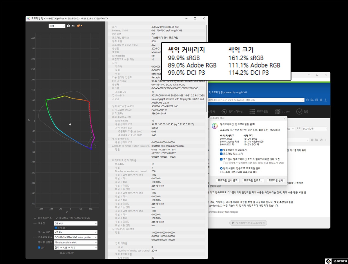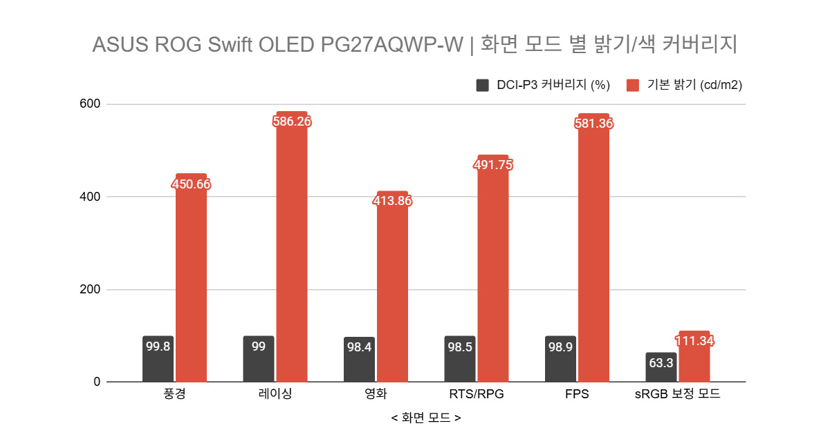 또한 전체 화면 백색(100% 화이트) 기준에서도 OLED Care on 상태 약 345nit 수준의 밝기가 유지되며, 기존 OLED 구조에서 흔히 체감되던 급격한 밝기 저하 현상과는 분명한 차이를 보인다. 단순히 순간 최대 밝기가 높은 것이 아니라, 일상적인 사용 환경과 전체 화면 구성 환경 모두에서 체감 밝기가 유지되는 구조라는 점에서 의미가 크다.실제 색 재현 측면에서도 구조적 완성도는 수치로 뒷받침된다. 기본 모드(레이싱 모드) 기준 DCI-P3 약 99%, sRGB 약 99% 수준의 색역 커버리지, 그리고 색 정확도 측정에서도 평균 dE 0.57, 최대 dE 1.52를 기록했다. 색이 과장되지 않으면서도 정확하게 표현되는 구조가 수치와 체감 모두에서 일관되게 확인된다.