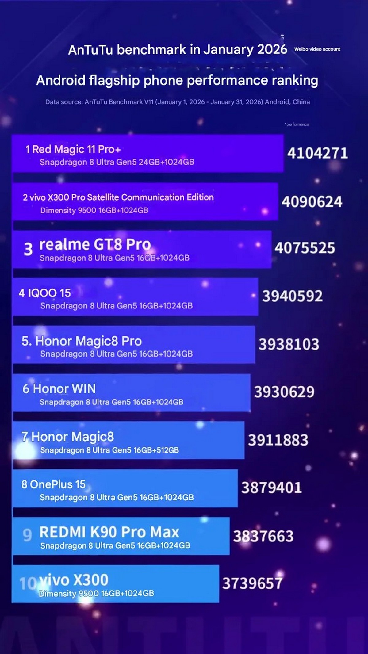 안투투가 공개한 2026년 1월 성능 순위에 따르면, 스냅드래곤 8 엘리트 5세대를 탑재한 레드매직 11 프로+는 세계 최초 액체 냉각 시스템과 대형 쿨링 팬을 앞세워 410만 점을 돌파하며 4개월 연속 1위를 기록했다. 2위는 미디어텍 디멘시티 9500을 탑재한 비보 X300 프로가 차지했다.