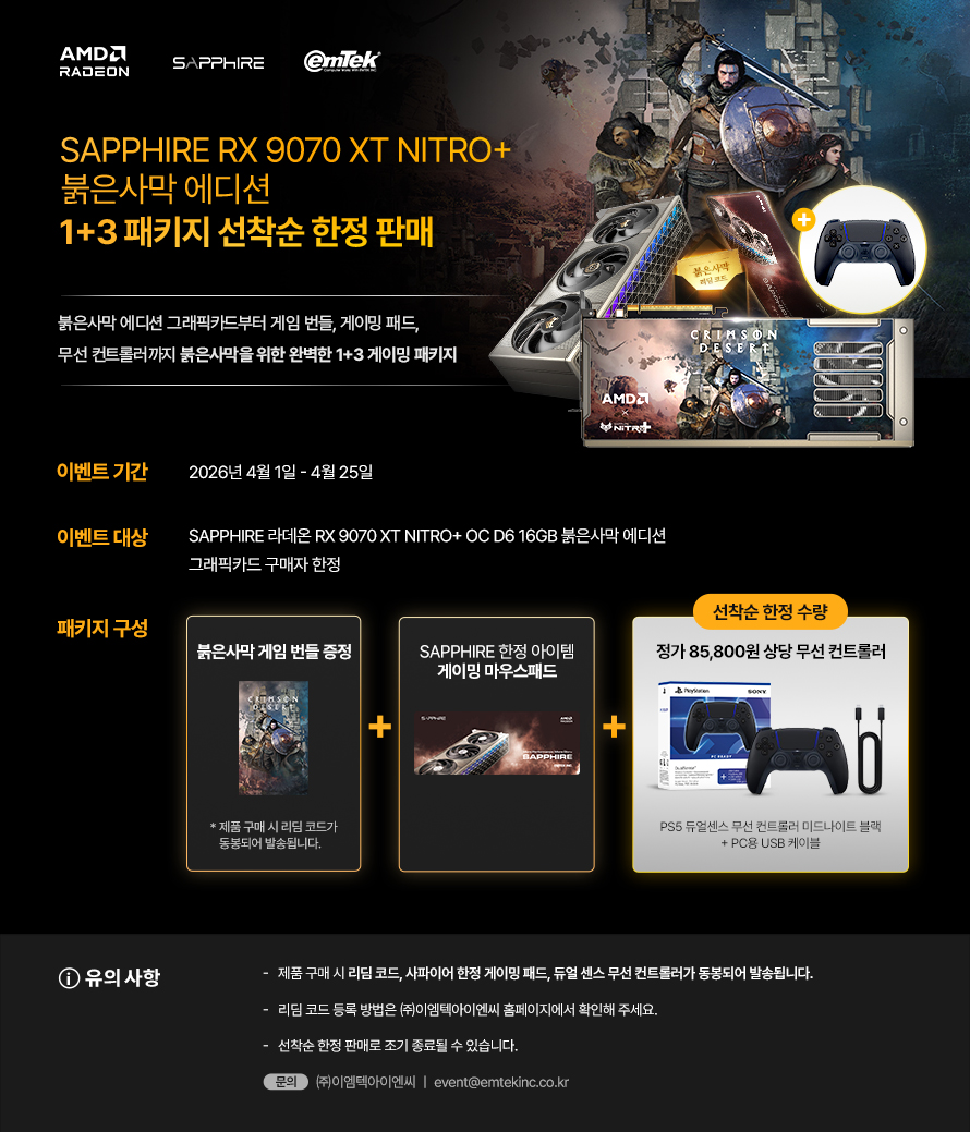 오랜 기간 국내 게이머들과 함께해오며, 차별화된 고객지원을 통해 게임 플레이 환경을 책임져온 ㈜이엠텍아이엔씨(대표: 서영식, 이하 이엠텍)는 대작 액션 어드벤처 게임 ‘붉은사막’의 정식 오픈을 기념하여, 높은 관심 속에 진행 중인 ‘SAPPHIRE 라데온 RX 9070 XT 붉은사막 에디션 1+3 패키지’ 프로모션을 4월에도 이어간다고 밝혔다.